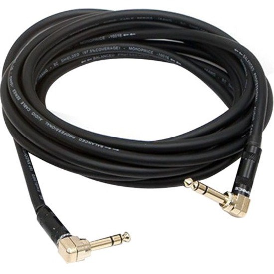 This cable features 90-degree TRS/Stereo plugs on each end. It uses 16 AWG stranded, pure copper conductors and employs copper braid shielding with 97.5% coverage to ensure that stray radio frequency and electromagnetic signals do not degrade the audio quality of your performance. The plugs are gold plated to provide smooth, corrosion-free connections as well as maximum electrical conductivity.
